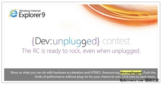 今天早些時候有媒體披露了“IE9盡享網(wǎng)絡(luò)之美”網(wǎng)站上的一個神秘新頁面“Dev:unplugged”,之所以說它神秘是因為微軟沒有提供任何信息,只是說不久就會有史詩性事件發(fā)生,這莫非是在說IE9正式版發(fā)布?