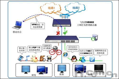 上班時間閑聊、游戲、團購……,嚴重影響工作效率。飛魚星VE602具有一體化的上網行為管理體系,從網址分類管理、WEB安全管理、聊天軟件管控、P2P軟件管控、股票軟件管控、熱門游戲管控(例如QQ游戲、開心農場、開心網等)、分組分時段管控等進行全方位的上網行為管理。幫助中小企業用戶在沒有專業網管的情況下,也能用好網絡,管好網絡,全面提升員工的工作效率。