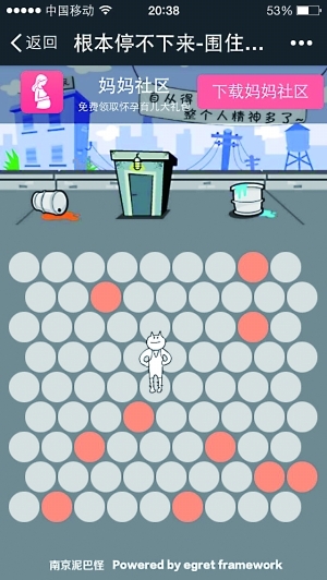 從上周三起,朋友圈就被一只表情很欠、身材妖嬈的貓無情“刷屏”了。“我用了11步圍住神經貓,擊敗89%的人,你能超過我嗎?”游戲規則很簡單,在一個異化版的圍棋界面上,玩家需要做的只是點擊圓點圍住“神經貓”。但其默認分享的模板設置,讓朋友們紛紛陷入“秀智商”模式,你追我趕地比拼最小步數,按游戲宣傳語的話說,就是“根本停不下來”。