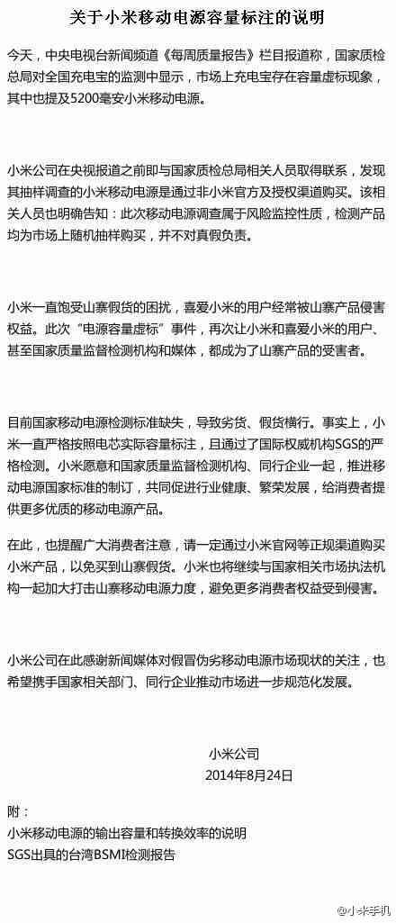 小米在聲明中表示,他們在央視報道前即與國家質檢總局相關人員取得聯系,參與抽樣調查的小米移動電源,并非是從小米官方渠道或授權渠道購買的產品。