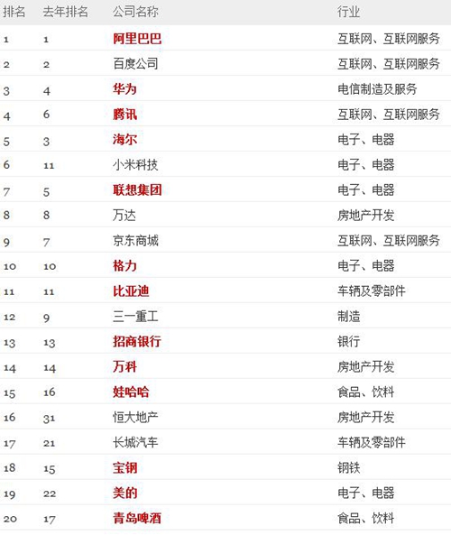 《財富》最受贊賞的中國公司全明星榜前20位企業(yè)一覽 (紅色表示該公司在過去六年中連續(xù)上榜)