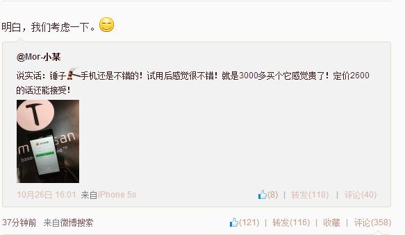10月27日,羅永浩今日轉(zhuǎn)發(fā)錘子手機(jī)用戶的微博,表示考慮對手機(jī)進(jìn)行降價(jià)。微博用戶@Mor-小某 昨日發(fā)微博稱:“錘子手機(jī)還是不錯(cuò)的!試用后感覺很不錯(cuò)!就是3000多買個(gè)它感覺貴了!定價(jià)2600的話還能接受!”羅永浩今天轉(zhuǎn)發(fā)了其降價(jià)的微博,并表示:“明白,我們考慮一下。“這可能是錘子手機(jī)降價(jià)的信號。