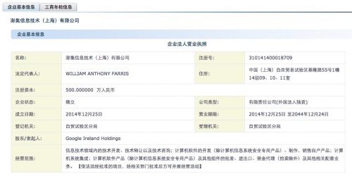 工商資料顯示,澎集信息成立于2014年12月25日,股東為Google Ireland Holdings(谷歌愛(ài)爾蘭控股),法人代表是William Anthony Farris,注冊(cè)資本為500萬(wàn)元。該公司的經(jīng)營(yíng)范圍包括:信息技術(shù)領(lǐng)域內(nèi)的技術(shù)開發(fā)、技術(shù)轉(zhuǎn)讓以及技術(shù)咨詢;計(jì)算機(jī)軟件的開發(fā)(除計(jì)算機(jī)信息系統(tǒng)安全專用產(chǎn)品)、制作,銷售自產(chǎn)產(chǎn)品;計(jì)算機(jī)系統(tǒng)集成;計(jì)算機(jī)軟件產(chǎn)品(除計(jì)算機(jī)信息系統(tǒng)安全專用產(chǎn)品)及其他組件的批發(fā)、進(jìn)出口、傭金代理(拍賣除外)及其他相關(guān)配套業(yè)務(wù)。