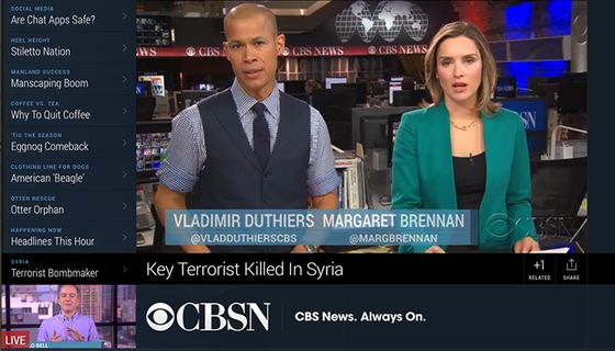 2014年底,CBSN首先在Xbox One提供,后來(lái)到達(dá)Amazon Fire TV,Android TV,Apple TV,Roku等平臺(tái)。這些平臺(tái)的共同特點(diǎn)就是類(lèi)似國(guó)內(nèi)小米、樂(lè)視等盒子或互聯(lián)網(wǎng)電視機(jī),存在繞過(guò)有線或無(wú)線電視網(wǎng)觀看視頻節(jié)目的方法,也就是所謂的OTT服務(wù)。除此之外,CBSN也可以在CBS新聞的官方網(wǎng)站、iOS和Android客戶(hù)端收看。