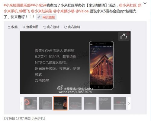 昨天,有微博用戶曝光了一組據說是“小米5發布會PPT”的相關圖片,而該系列圖片中,關于小米5的各類信息配置一應俱全,大有提前揭露底牌之勢。