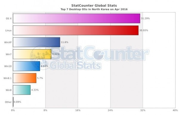 我們已經(jīng)知道,金正恩是一個(gè)蘋果迷,但是看到那么多朝鮮人使用Mac OS X仍然讓人驚喜。根據(jù)StatCounter統(tǒng)計(jì)數(shù)據(jù)顯示,蘋果Mac OS X操作系統(tǒng)在朝鮮市占率達(dá)到31.29%,位居第一。位居第二的是開源的Linux操作系統(tǒng),Linux操作系統(tǒng)在該國的市占率達(dá)到30.92%。