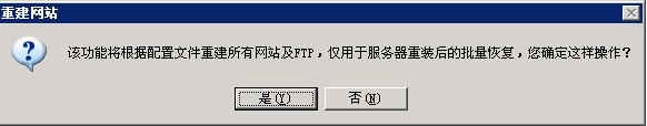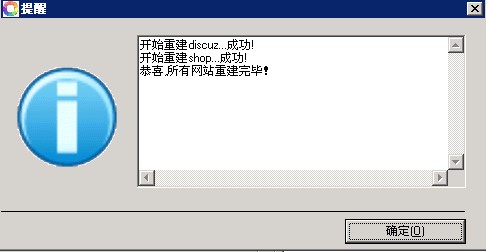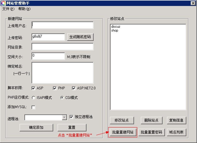 3、點(diǎn)擊提示對話框,會(huì)自動(dòng)打開“網(wǎng)站管理助手”,點(diǎn)擊“批量重建站點(diǎn)”,系統(tǒng)會(huì)自動(dòng)重建用戶賬戶、IIS站點(diǎn)、FTP和mysql。重建成功后會(huì)有相應(yīng)提示。
